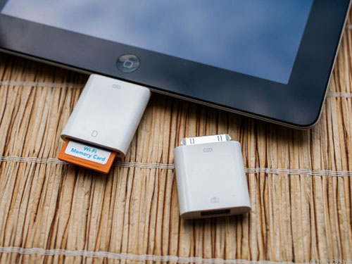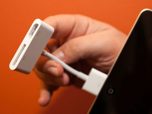 iPad không có khe cắm thẻ SD hoặc USB. Nhưng với bộ kết nối (connection kit) màu trắng đặc trưng của Apple, người dùng có thể chuyển ảnh, video từ các thiết bị khác sang iPad để xem hoặc chỉnh sửa một cách dễ dàng.