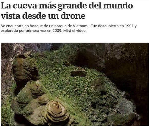 Trang điện tử báo Clarin, một trong những tờ báo có nhiều bạn đọc nhất Argentina, mới đây đã đăng bài viết ca ngợi vẻ đẹp của hang Sơn Đoòng cùng với một đoạn video dài hơn 6 phút quay lại phong cảnh hùng vĩ có một không hai của địa danh này.