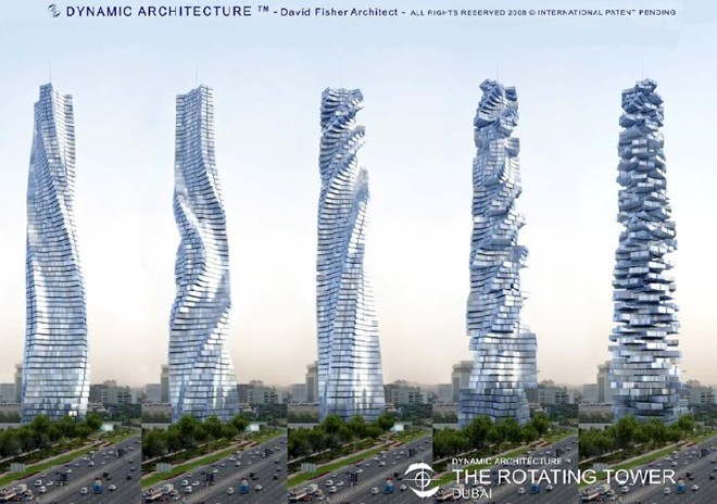 Lấy cảm hứng từ hình ảnh cát chảy, Rotating Tower là tòa nhà cao 420m với 80 tầng, có khả năng quay tròn 360 độ xung quanh một trục chính điều khiển bằng 79 tua bin chạy bằng sức gió lắp đặt tại mỗi tầng. Công trình này luôn chuyển động thay đổi hình dáng, đồng thời sản sinh ra điện năng cho chính nó cũng như những tòa nhà nằm kế bên.