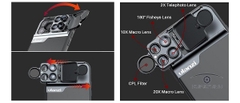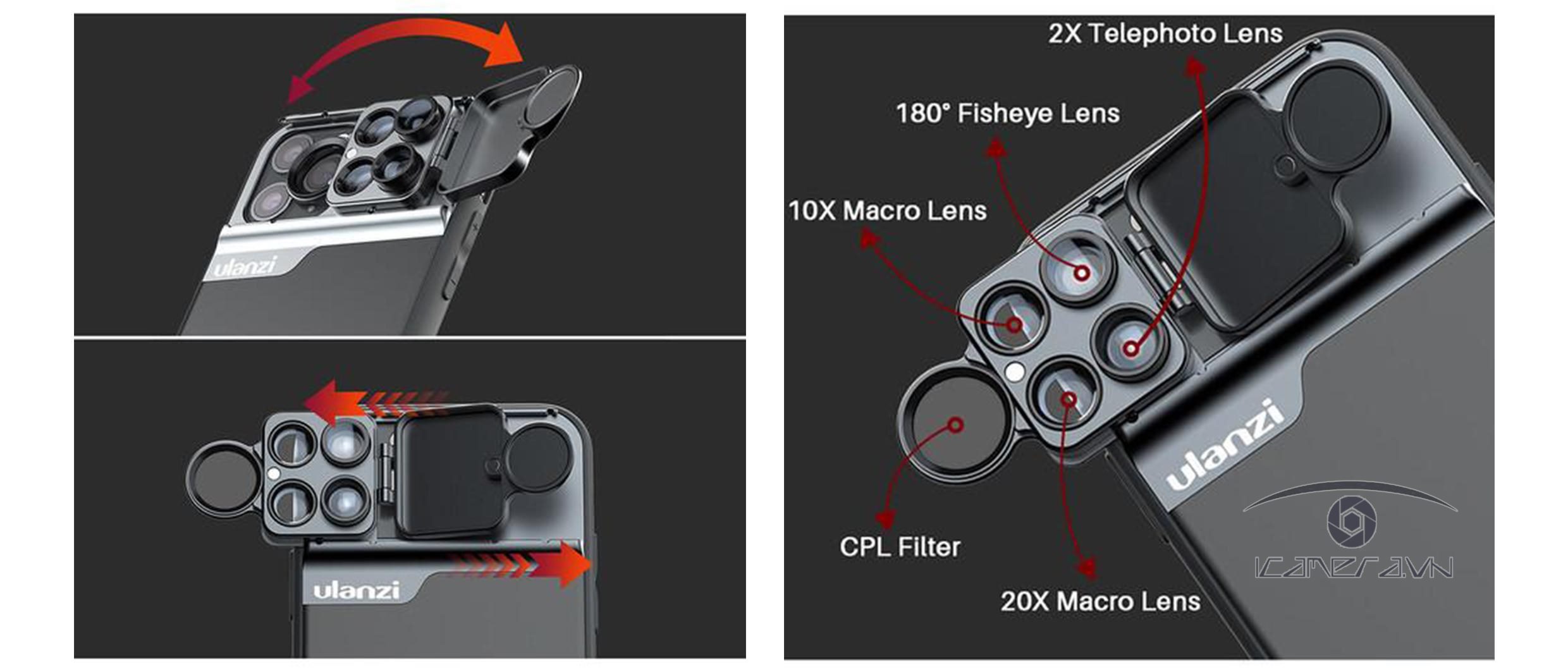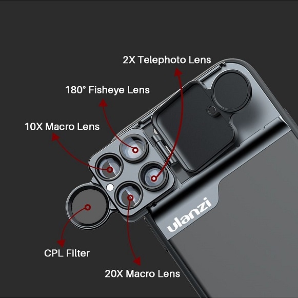 Ulanzi U-Lens hỗ trợ tăng cường khả năng của camera trên các dòng iPhone 11, iPhone 11 Pro và iPhone 11 Pro Max, với 5 hiệu ứng ống kính bổ sung mà vẫn giữ được yếu tố gọn nhẹ cho điện thoại của bạn. Cấu trúc thanh trượt ống kính/kính lọc kết hợp cửa lật ra để lộ 4 ống kính và 1 kính lọc tích hợp. Các ống kính và kính lọc này đều được lắp trên một đường ray sẵn, cho phép bạn trượt và áp dụng ngay trên camera của điện thoại. Các ống kính và kính lọc bao gồm: