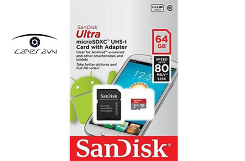 1. Thẻ nhớ Micro SD Sandisk 64GB tốc độ cao 80MB/s đi kèm SD Adapter