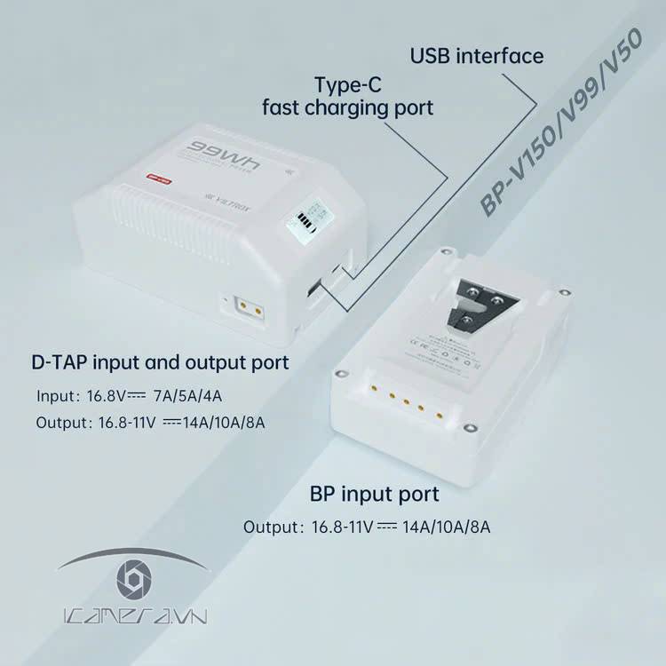Cổng D-Tap và USB-C cũng có thể được sử dụng làm đầu vào để sạc pin bằng bộ sạc nhanh tùy chọn hoặc bộ sạc V-mount tiêu chuẩn có thể sạc pin. Có nhiều tính năng bảo vệ dòng điện tích hợp để bảo vệ pin của bạn khỏi tình trạng sạc quá mức/xả quá mức, đoản mạch, quá áp, quá nhiệt và bảo vệ trường điện từ. Màn hình LCD sáng hiển thị trạng thái tuổi thọ pin của bạn.