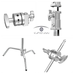 Sản phẩm có 3 chân chắc chắn dạng chữ C, đặt được trên nhiều mặt phẳng khác nhau, có thể tháo lắp dễ dàng. Đặc biệt, chân đèn còn có 2 griphead dùng để gài đèn, các loại tản sáng, dù, steady cam… Bộ phận này cũng được làm bằng hợp kim nhôm chắc chắn, độ bền cao, có đầu female 1/4 và 3/8, sử dụng linh hoạt.