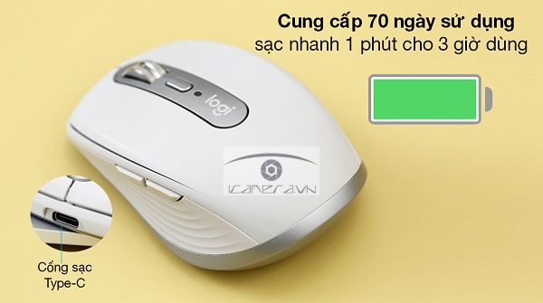 Nếu chuột Logitech yếu pin, bạn có thể sạc "tốc hành" 1 phút để có 3 giờ xử lý công việc kịp thời. Thời gian sử dụng của chuột dài hay ngắn tùy vào mức độ sử dụng của mỗi người.