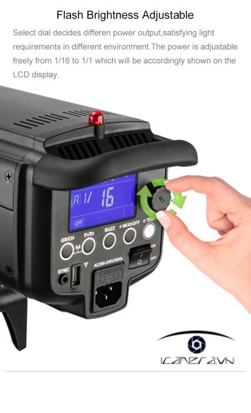 Ngay bên cạnh màn hình là một nút xoay, giúp bạn thoải mái điều chỉnh năng lượng từ 1/16 đến 1/1, được hiển thị ngay trên màn hình LCD. Độ sáng cũng có thể được tuỳ chỉnh từ 5% đến 100%. Sản phẩm được cải tiến với cổng USB để có thể thay đổi nguồn của trigger không dây.