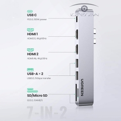 Tính năng chính hub USB Type C to 2 HDMI, USB 3.0, đọc thẻ SD/TF hỗ trợ sạc USB C Ugreen 80548