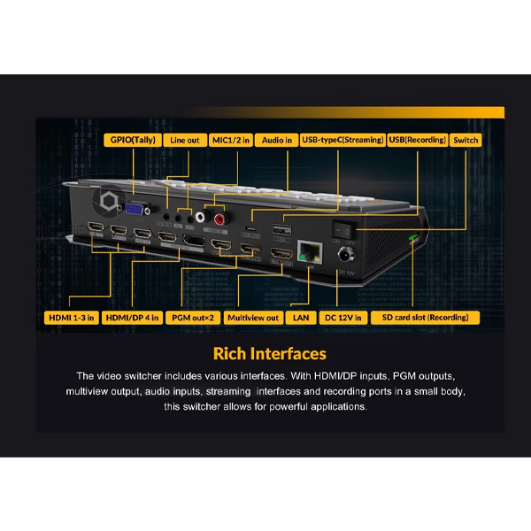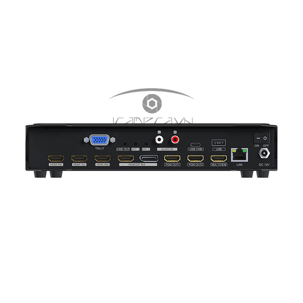 Nhiều giao diện bao gồm đầu vào HDMI và DisplayPort, đầu ra Chương trình, đầu ra nhiều chế độ xem, đầu vào âm thanh, cổng phát trực tuyến và ghi âm.