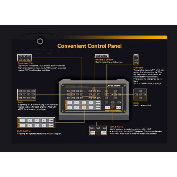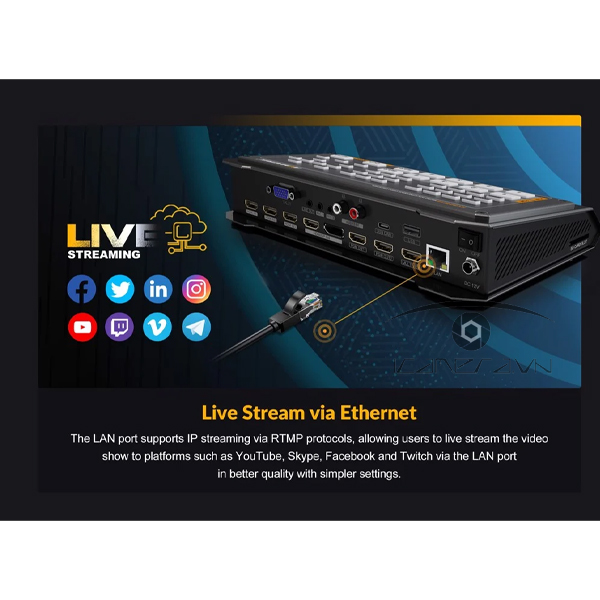Bộ chuyển đổi nhỏ gọn này cung cấp tính năng phát trực tuyến RTMP qua cổng LAN, hỗ trợ đầu vào và đầu ra video lên đến 1080p60, đồng thời cung cấp khả năng trộn âm thanh bằng cách sử dụng hai đầu vào và đầu ra mic/line 3,5mm âm thanh nổi.