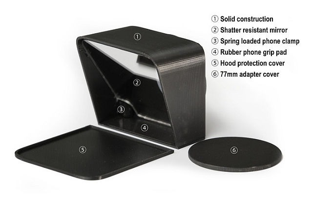 Ngoài ra, mặt sau của bộ máy nhắc chữ còn tích hợp sẵn ngàm giữ ống kính kích thước 77mm, đây là một kích thước rất phổ biến cũng như tương thích với hầu hết các bộ điều hợp ống kính cho phép bạn lắp giữ trực tiếp bộ máy nhắc chữ lên ống kính máy ảnh. Các bạn cũng không cần lo lắng nếu như những chiếc ống kính của bạn không có kích thước này, bởi ngay trong bộ sản phẩm các bạn cũng sẽ được tặng kèm các ngoàm gắn kích thước khác, như là: 72mm, 67mm, 62mm, 58mm, 55mm, 52mm và 49mm.
