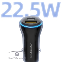 Sạc PISEN Car, sạc trên ô tô hoàn toàn tương thích với tất cả các thiết bị, có hai cổng đầu ra USB_A với công suất 22,5W và Type-C với công suất tối đa 20W.