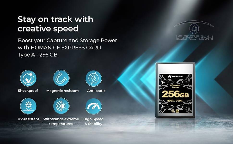 – HOMAN CFexpress Card Type-A 256GB/512GB/1TB : Tốc độ đọc tối đa 900MB/s, Tốc độ ghi tối đa 800MB/s