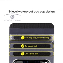 - Với thiết kế miệng túi khóa 3 cấp độ điện thoại sẽ được chống nước, bụi và cát hoàn toàn.