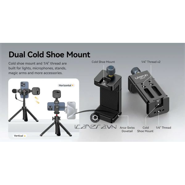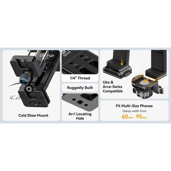 Ulanzi MA33 - Ngàm kẹp điện thoại Được cấu tạo từ chất liệu hợp kim nhôm đảm bảo độ cứng cáp của kẹp Phần đế tích hợp ngàm 1/4'', arca swiss dễ dàng kết nối với nhiều...