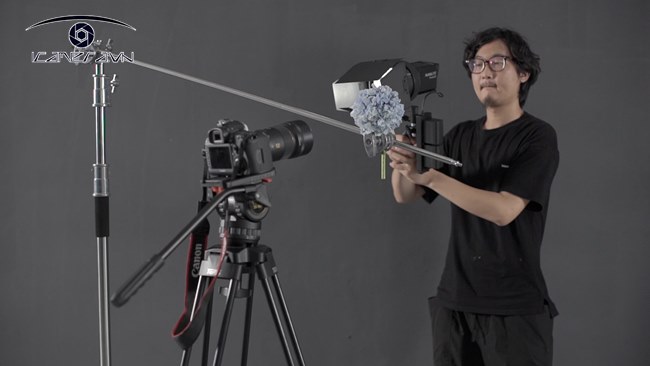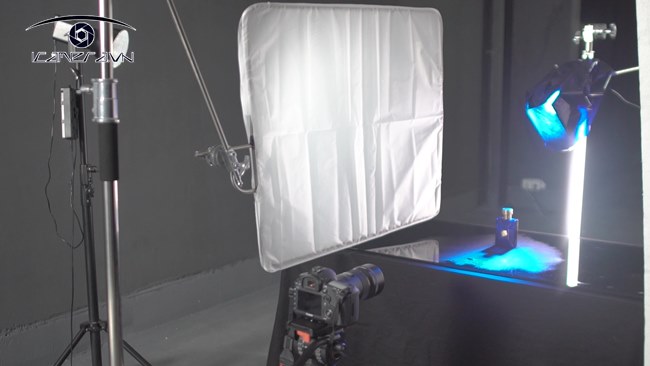 Chọn một tấm nhựa PVC màu trắng, đặt nó xuống và cố định các cạnh của nó để giữ cho nó phẳng. Cố định máy ảnh, di chuyển đèn Forza 60 được cài đặt với tay cầm để thay đổi góc ánh sáng.