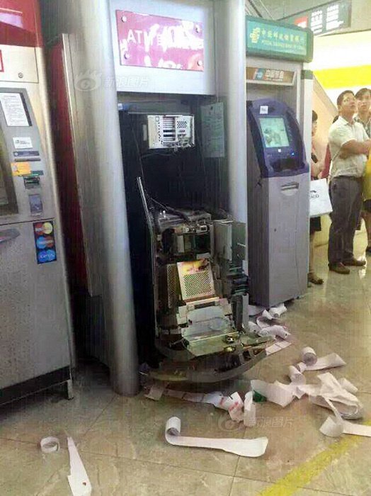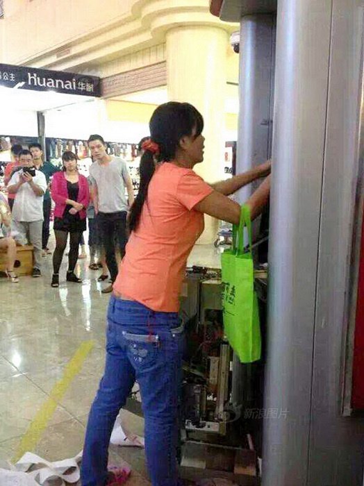 Ngày 16/10 ở một trung tâm mua sắm ở Quảng Đông (Trung Quốc), một người phụ nữ khi rút tiền thì bị nuốt thẻ. Chị này tức giận phá luôn cả máy ATM. Sự việc gây náo loạn và nhiều người hiếu kỳ đứng quan sát sự việc.