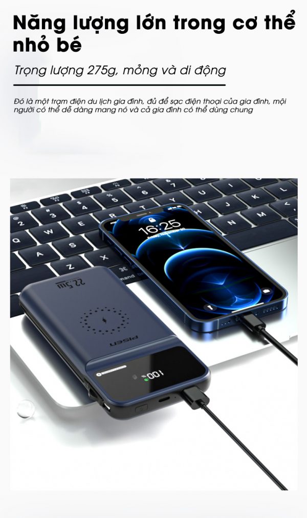Kích thước nhỏ chỉ bằng 1 chiếc điện thoại và trọng lượng rất nhẹ chỉ 275g, Pisen Quick MagSafe thực sự là một trạm năng lượng di động giúp đáp ứng nhu cầu sử dụng cả gia đình bạn.