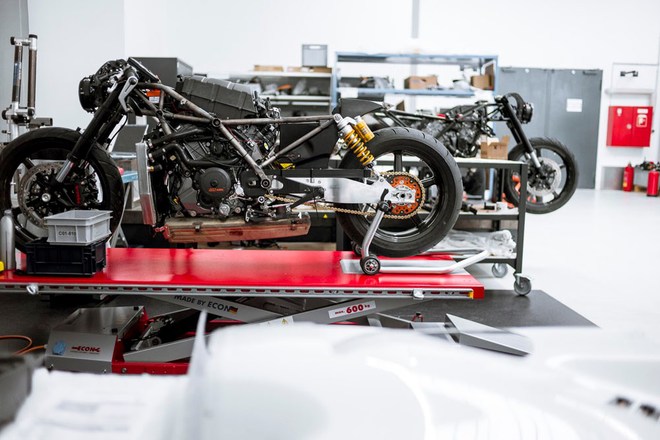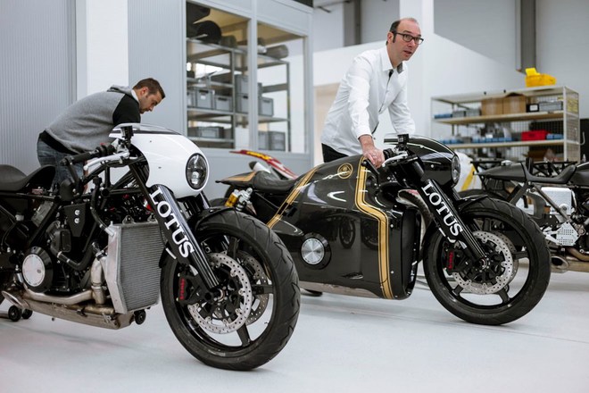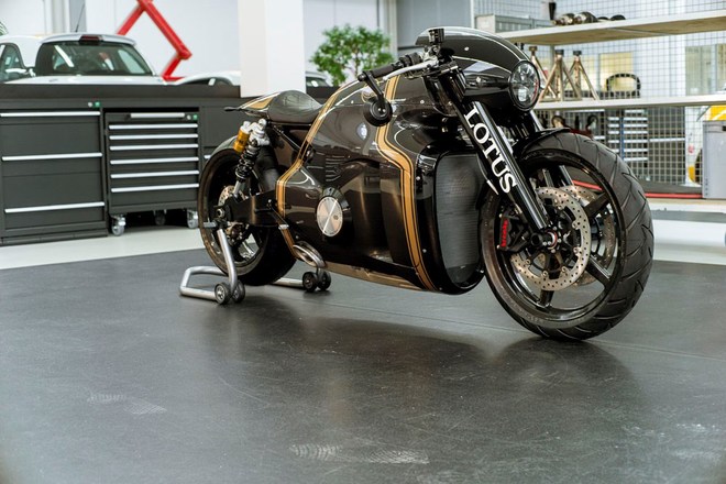 Động cơ của Lotus là loại V-twin 1.195 phân khối, làm mát bằng nước, mượn từ KTM RC8R, cho công suất 175 mã lực, hộp số 6 cấp. Gắp đôi phía sau làm từ nhôm rỗng. Cặp giảm xóc Ohlins gắn trực tiếp vào khung và gắp.