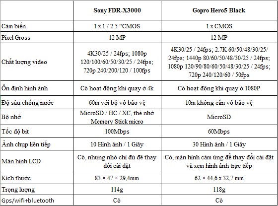 Trước tiên hãy cùng điểm qua thông số kỹ thuật của Sony FDR-X3000/R và Gopro Hero5 Black.