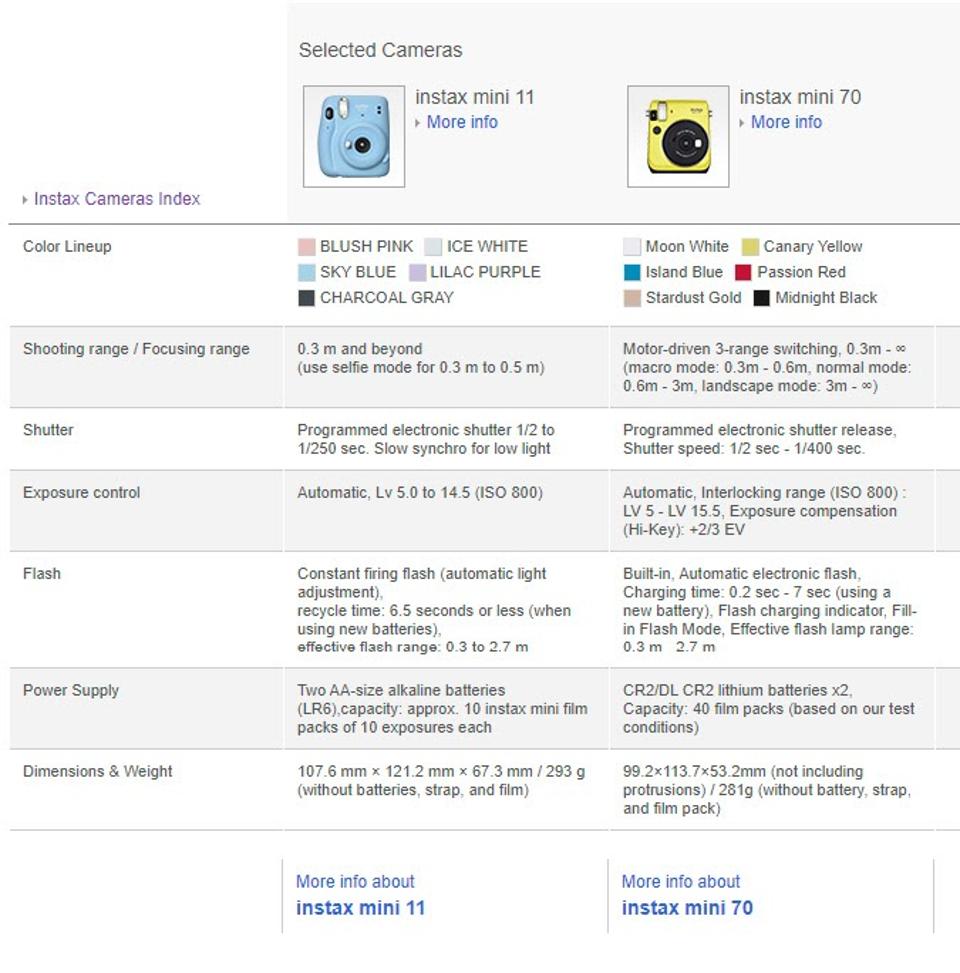 Một bảng so sánh các tính năng chính của phiên bản Instax Mini 11 và Instax Mini 70.