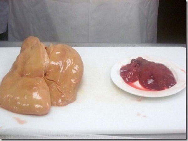 Gan ngỗng được vỗ béo (trái) và gan ngỗng thường (phải).