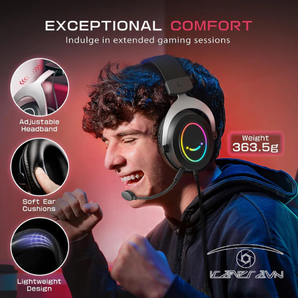 Phần đệm tai (earcup) được làm từ chất liệu da mềm mại thoáng khí, ôm trọn vành tai để cách âm thụ động hiệu quả mà không gây bí bách. Khung tai nghe chắc chắn nhưng linh hoạt, có thể tùy chỉnh kích thước để phù hợp với mọi cỡ đầu, giúp bạn chiến game trong thời gian dài mà không bị đau nhức.
