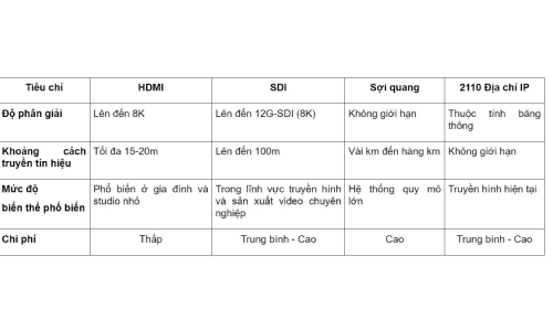 Trong lĩnh vực truyền hình, việc làm phương pháp truyền tín hiệu video là một trong những yếu tố quan trọng để đảm bảo chất lượng và hiệu suất sản xuất. Hiện nay, có bốn loại kết nối phổ biến nhất bao gồm HDMI, SDI, Optical Fiber và 2110 IP. Mỗi loại kết nối này đều có những ưu nhược điểm riêng, phù hợp với các yêu cầu kỹ thuật và môi trường làm việc khác nhau.