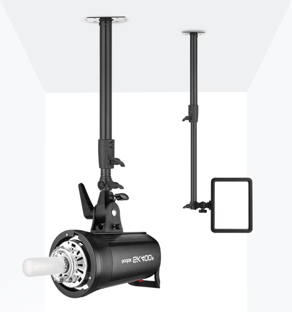 Tay treo đèn thả trần giúp tiết kiệm không gian trong studio và dễ dàng chiều chỉnh các góc ánh sáng .