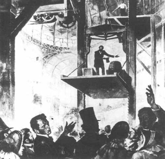 Đứng trên một bục sàn được cẩu cao qua khỏi đầu đám đông tại Crystal Palace ở New York, Otis thực sự gây sốc cho đám đông khi ông đột ngột cắt dây treo duy nhất chịu lực nối bục sàn mà ông đang đứng. Đám đông đã hết sức ngạc nhiên và có phần lo lắng. Thế nhưng chiếc thang máy đã dừng lại sau khi rơi xuống vài cm khiến tất cả đều trầm trồ, phá tan mọi nỗi lo sợ về tai nạn khi thang máy rơi.