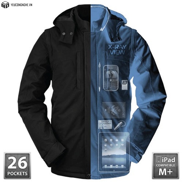 Dưới đây là hình ảnh một chiếc áo khoác mùa đông ấm áp – nó bao gồm tất cả kể cả việc giữ nhiệt hay thiết bị điện tử yêu thích của bạn. Nó có 26 túi để chứa tất cả mọi thứ từ kính của bạn và điện thoại thông minh của bạn, cho đến một iPad. Mũ áo và tay áo là có thể tháo rời để kiểm soát nhiệt độ. Nó cũng có tính năng đặc biệt là chỗ để dây cho tai nghe.