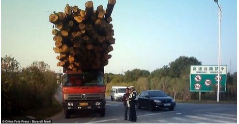 Tiếp tục là xe chở gỗ tại Trung Quốc, không biết sẽ như thế nào nếu đống gỗ này rơi xuống. Rất may chiếc xe đã bị cảnh sát tạm giữ.