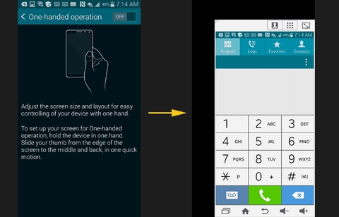 Nhiều khi người dùng cảm thấy bực bội khi phải kéo căng ngón tay cái của họ trên màn hình để chạm được vào một biểu tượng hoặc số trên bàn phím. Samsung đã giải quyết khó chịu đó bằng tính năng hoạt động một tay, cho phép co toàn bộ màn hình lại với kích thước người dùng cảm thấy thoải mái nhất và ngược lại.
