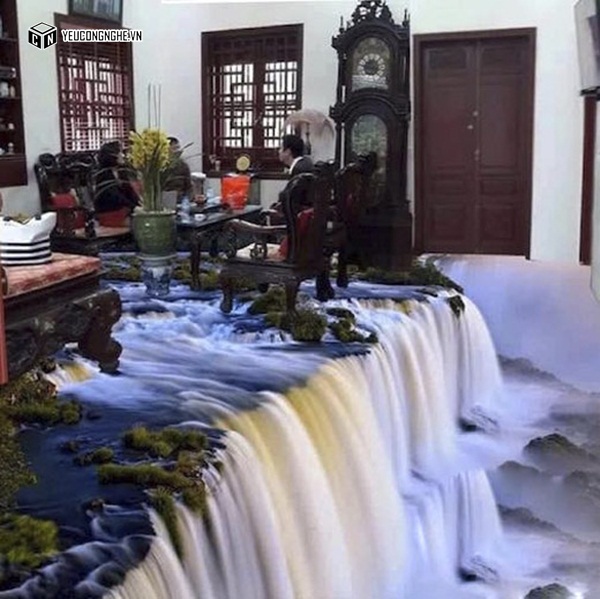 Mới đây, hình ảnh của một căn phòng khách được đặt giữa một thác nước chảy xiết khiến người xem ngã ngàng, kinh ngạc. Nó được cho là tác phẩm của "nghệ thuật sàn nhà 3D" sáng tạo, và nhận được nhiều sự ngưỡng mộ của nhiều người.