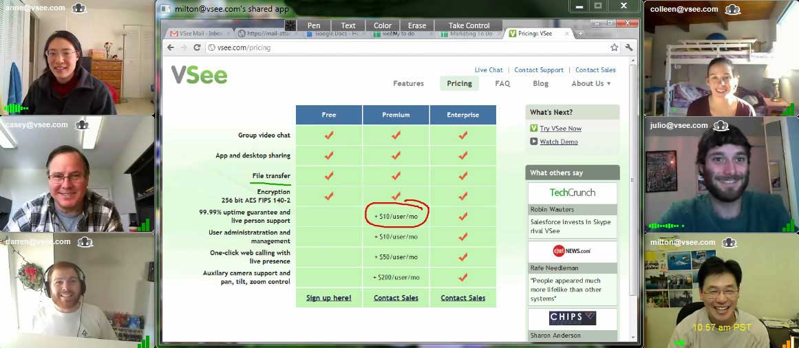 Vsee là phần mềm sử dụng mô hình kết nối peer — to — peer thay thế cho trung tâm máy chủ với các phần mềm họp trực tuyến khác. Phần mềm này được tải và cài trên máy tính có thể trao đổi hình ảnh trực tiếp với nhau.
