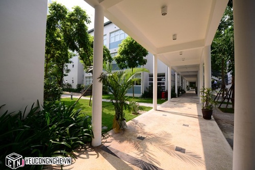 Hành lang vòng cung nối liền các tòa nhà, tạo thuận lợi cho việc di chuyển của giáo viên và học sinh.