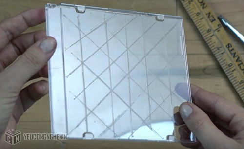 Quá trình lám rất đơn giản. Bạn chỉ cần lấy phần nhựa trong suốt của hộp đựng đĩa CD, sau đó, sử dụng dao cắt giấy hoặc bất cứ vật nhọn khác để tạo ra các đường xước thẳng trên vỏ CD. Đầu tiên, hãy cắt thành những đường chéo song song và cắt nhau giống như chữ X, sau đó lại tiếp tục cắt tiếp những đường thẳng vuông góc. Ở bước này, hãy cẩn thận vì các vật nhọn có thể gây tổn thương cho bạn bất cứ lúc nào. Sau khi làm xong, bạn sẽ có một miếng nhựa trông như thế này.