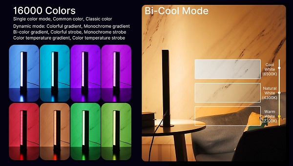Chế độ màu RGB, 16000 có thể được thay đổi. Nhiều màu sắc có thể được tuỳ chỉnh theo ý muốn. Single color mode, Common color, Classic color Dynamic mode: Colorful gradient, Monochrome gradient, Bi-color gradient, Colorful strobe, Monochrome strobe, Color temperature gradient, Color temperature strobe.