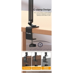 ◾ Phần kẹp chữ C sử dụng cấu trúc khóa vít, phù hợp với các bề mặt bàn bàn thông thường trong phạm vi 58mm (2,28''), chẳng hạn như: bàn làm việc, mặt bàn bếp, đầu giường, v.v.