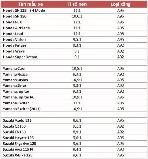 Sau 2 ví dụ trên thì chắc các bạn cũng hiểu được sự quan trọng của việc đổ đúng xăng cho phù hợp với chiếc xe của mình. Nó không chỉ giúp chúng ta tiết kiệm được khoảng tiền chênh lệch 600 đồng trước mắt, mà nó còn giúp chiếc xe luôn hoạt động ở điều kiện lý tưởng và bền bỉ hơn là điều chắc chắn. Sau đây là bảng tỉ số nén động cơ của những chiếc xe máy thông dụng trên thị trường để các bạn tham khảo và chọn loại xăng phù hợp nhất. Còn với xe ô tô hay những mẫu xe tay ga cao cấp như Vespa thì xăng A95 là sự lựa chọn duy nhất.