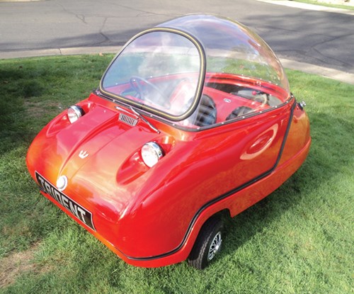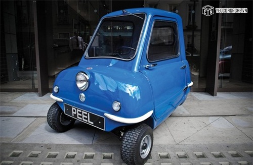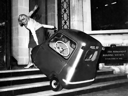 Hình ảnh quảng cáo cho mẫu xe Peel P50 tại Anh Peel P50 được thiết kế có 3 bánh và 1 cửa, trang bị động cơ 49cc, hộp số sàn 3 cấp, không có số lùi. Vì vậy, để lùi xe, tài xế phải ra khỏi buồng lái, kéo xe từ phía sau.