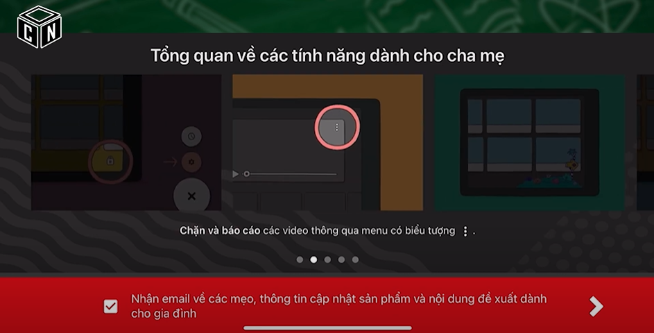 - Sau khi thiết lập hồ sơ, youtube kids sẽ tổng quan lại các tính năng mà cha mẹ nên biết: (khóa video, chặn và báo cáo video, xem lại các video mà trẻ đã xem, hẹn giờ khóa ứng dụng, lưu video,..)