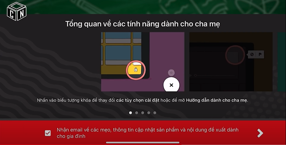 - Nếu ấn chọn Tôi là cha/mẹ, app sẽ đưa ra một vài thiết lập cần thiết để kiểm soát an toàn trong quá trình sử dụng cho trẻ. (Năm sinh, đăng nhập tài khoản và tạo hồ sơ xem phù hợp với mỗi trẻ)